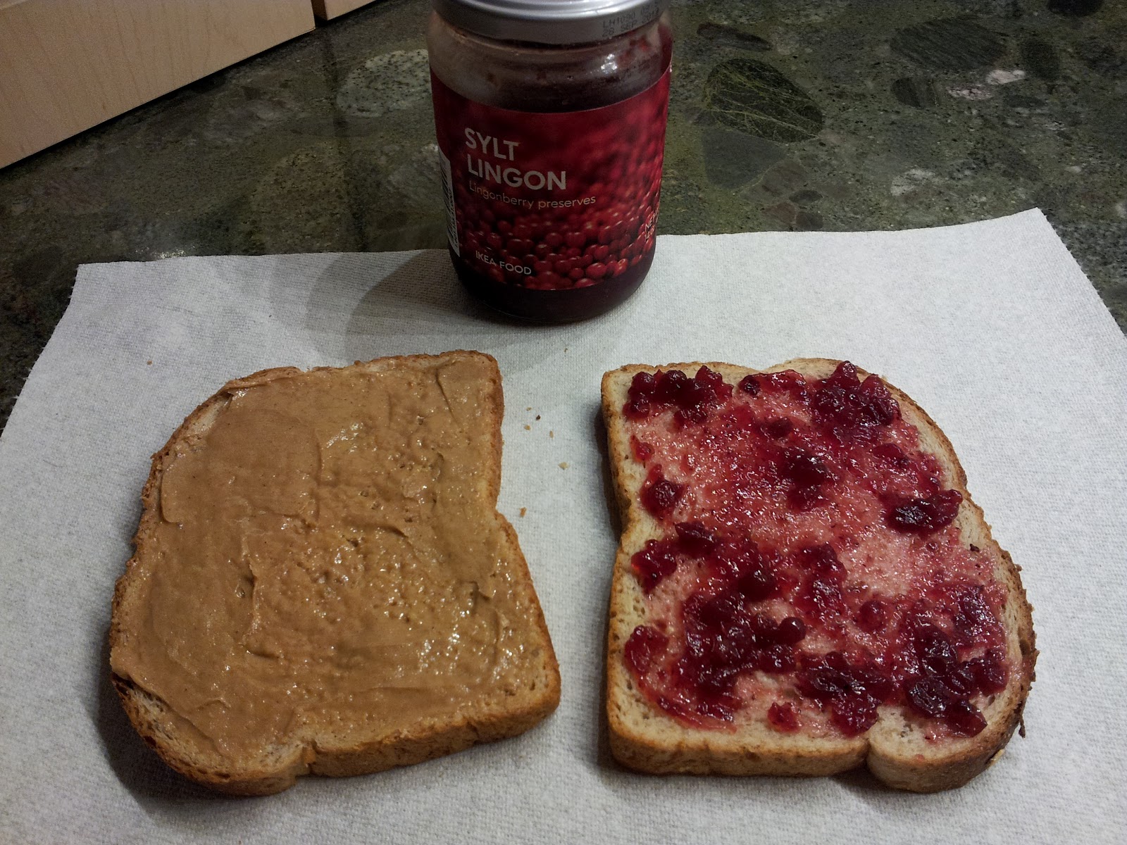 Det var bara sådär så jag kommer nog inte göra det igen. Lingonsmaken var inte tillräckligt stark för att kämpa med jordnötsmöret. I fortsättningen blir det nog hallonsylt för min del. Men det var kul att prova.