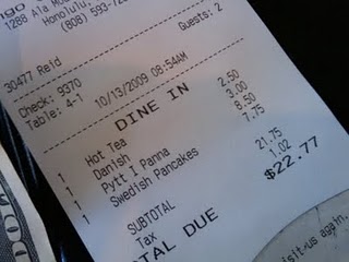 Jag älskar svenska plättar och var mycket exalterad då jag såg det i Tangös frukostmeny. Jag hade höga förväntningar och plättarna smakade mycket goda och autentiska. Men, vad var det som serverades med plättarna? Jag hade väntat mig lite sylt….jordgubbsylt eller lingon…samt kanske några jordgubbar eller andra nordliga bär vid sidan om. Tyvärr kom plättarna täckta med inte bara bär utan även tropiska frukter. Det kändes inte alls svenskt men å andra sidan kanske det fungerar bättre så här i Hawaii. Kockar anpassar ju ofta deras skapelser efter de lokala behoven. Det var gott men inte ljuvligt.